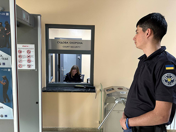 В суді наявний безпечний периметр навколо будівлі суду, контрольований доступ до входів та виходів, окремі маршрути для суддів, потерпілих та підсудних, тривожна кнопка, укриття.